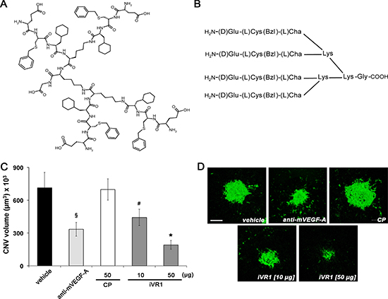 Figure 1: Anti-angiogenic activity of iVR1 in vivo. (A) Chemical structure of iVR1 tetrameric tripeptide that has a calculated molecular mass of 2362.02 g/mol. (B) Schematic representation of the iVR1. L-Cys(Bzl): L-cysteine(S-benzyl); L-Cha, L-cyclohexylalanine. (C) iVR1 inhibited laser-induced CNV in a dose-dependent manner, whereas CP was ineffective. CNV volumes were measured by confocal evaluation of Isolectin B4 staining of RPE-choroid flat mounts. Data are represented as the mean ± SEM (N = 8). *p < 0.0005 and §p < 0.01 compared to vehicle and CP; #p < 0.05 versus CP. (D) Representative pictures of CNV flat mounts. Scale bar: 100 μm.
