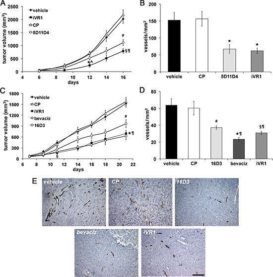 Figure 2: iVR1 inhibited growth and neo-angiogenesis of syngenic and xenograft colorectal tumors. CT26 mouse colon carcinoma cells (A) or HCT-116 human colorectal cancer cells (C) were injected subcutaneously in Balb/c mice or CD1 nude athymic mice, respectively. iVR1 and control peptide (CP) were delivered at 50 mg/kg each other day. Anti-PlGF mAbs 5D11D4 (mouse) and 16D3 (human) were delivered at 25 mg/kg twice a week. Bevacizumab (bevaciz) was delivered at 5 mg/kg, twice a week. Vehicle was PEG400/water 1:1. TV was measured three times a week and data are represented as the mean ± SEM (N = 7). A, *p < 0.001 and §p < 0.0001 versus vehicle and CP; ^p < 0.02 and ¶p < 0.05 vs 5D11D4; #p < 0.002 versus vehicle and CP. C, §p < 0.01 and *p = 0.0001 versus vehicle and CP, ¶p < 0.05 versus 16D3; #p = 0.0027 versus vehicle and CP. Vessel density of syngenic (B) and xenograft (D) tumors, were calculated analyzing five optical fields for each tumor, counting CD31-positive vessels (brown). Data are represented as the mean ± SEM. B, *p < 0.007 versus vehicle and CP. D, §p < 0.005, #p < 0.02, and *p < 0.0005, versus vehicle and CP. ¶p < 0.05 bevaciz versus iVR1 and CP and iVR1 versus 16D3. (E) Representative pictures of CD31 staining (brown) of HCT-116 tumors. Scale bar, 100 μm.