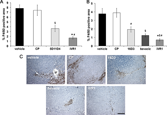 Figure 3: iVR1 inhibited the recruitment of monocyte-macrophages in syngenic and xenograft colorectal tumors. The area of monocyte-macrophage infiltrate in syngenic (A) and xenograft (B) tumors was determined by immunostaining with anti-F4/80 antibody and calculated on five optical fields for each tumor. Data are represented as the mean ± SEM (N = 7). A, *p < 0.0005 and §p < 0.01 versus vehicle and CP; #p < 0.002 versus 5D11D4 . B, *p < 0.0005, §p < 0.005 and #p < 0.05, versus vehicle and CP; #p < 0.05 versus bevacizumab (bevaciz); §p < 0.005 versus 16D3 (anti human PlGF mAb). (C) Representative pictures of F4/80 staining (brown) of HCT-116 tumors. Scale bar, 100 μm.