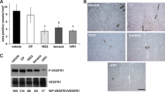 Figure 4: iVR1 inhibited the recruitment of smooth muscle cells in xenograft colorectal tumors blocking VEGFR1 activation. (A) Smooth muscle α-actin (SMA)-positive vessels were counted on five optical fields for each tumor to quantify density of vessels covered by SMCs. *p < 0.020 and §p < 0.05 versus vehicle and CP. (B) Representative pictures of SMA staining (brown) of HCT-116 tumors. Scale bar, 100 μm. (C) Top, western blot analysis of VEGFR1 phosphorylation performed on mixed matching amounts of protein extracts belonging to the same experimental tumor group. Low, normalization with anti-VEGFR1 antibody performed on the same filter. The values of densitometry analyses are shown. Values (in percentages) were calculated as the ratio of degree of receptor phosphorylation with respect to the total receptor amounts. The value of 100 has been arbitrarily assigned to vehicle.