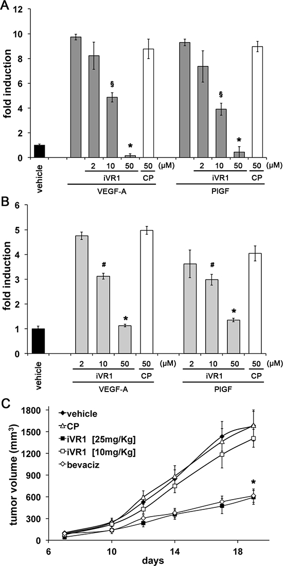 Figure 5: Dose-dependent inhibition of macrophage migration and xenograft tumor growth exerted by iVR1. iVR1, but not CP, was able to inhibit migration of mouse RAW264.7 macrophages (A) and ex vivo peritoneal macrophages (B) stimulated by VEGF-A or PlGF, in a dose-dependent manner. Data are expressed as fold induction with respect to vehicle (DMSO). A, *p < 0.0005 and §p < 0.001 versus CP and VEGF-A or PlGF. B, *p < 0.0005 and §p < 0.05 versus CP. (C) Dose-dependent inhibition of HCT-116 tumor growth exerted by iVR1 delivered at 10 or 25 mg/kg each other day. Bevacizumab (bevaciz) was delivered at 5 mg/kg two times at week. N = 7, *p < 0.001 versus vehicle and CP.