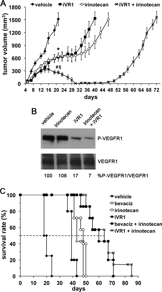 Figure 6: iVR1 showed a synergic effect in combination with irinotecan. (A), iVR1 (25 mg/kg, each other day) and irinotecan (50 mg/kg once at week) were delivered alone or in combination starting at day 5 from cell inoculation and for 24 days. TV was measured three times a week and data are represented as the mean ± SEM (N = 7). At day 21: *p < 0.005 for iVR1 and irinotecan compared to vehicle, §p < 0.0001 versus vehicle, #p < 0.005 vs iVR1 and irinotecan. (B), top, western blot analysis of VEGFR1 phosphorylation performed on mixed matching amounts of protein extracts belonging to the same experimental tumor group. Low, normalization with anti-VEGFR1 antibody performed on the same filter. The values of densitometry analyses are shown. Values (in percentages) were calculated as the ratio of degree of receptor phosphorylation with respect to the total receptor amounts. The value of 100 has been arbitrarily assigned to vehicle. (C), Kaplan-Meier survival curves of iVR1, irinorecan and bevacizumab (bevaciz, 5 mg/Kg two times a week) treatments, alone or in combination. Drugs were delivered as in A. Dashed line indicates 50% of survival. Bevaciz, irinotecan or iVR1 treatments were significantly lower compared to vehicle (p < 0.01) as well as the two combination treatments, iVR1 plus irinotecan and bevaciz plus irinotecan (p < 0.001).