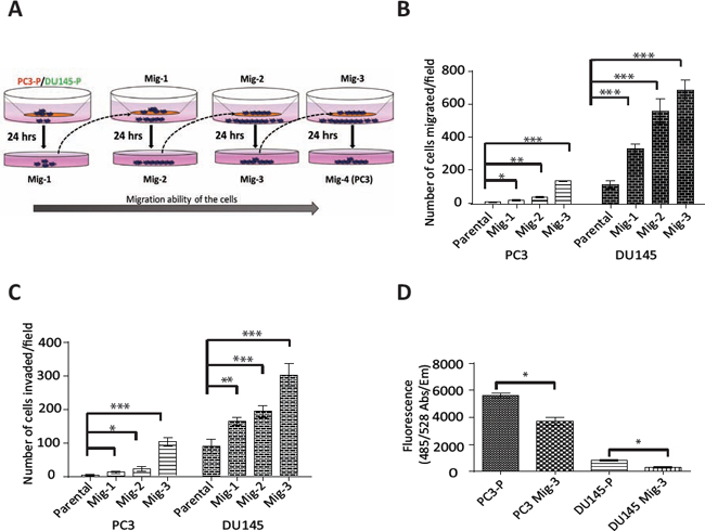 Figure. 1: Development and characterization of highly migratory variants of PCa cells. (A) Schematic diagram of isolation of migratory variants using a modified Boyden chamber assay. (B) In vitro migration and (C) invasion after each selection was determined using the modified Boyden chamber (migration) or matrigel-coated modified Boyden chamber (invasion) for 24 hours. Migrated (or invaded) cells were counted microscopically in 5 optical fields per filter. Bars represent mean ± SD from triplicate assays. *p < 0.05, **p < 0.001, ***p < 0.0001 by Student's t-test. (D) Attachment assay was performed for the indicated cells for 30 minutes. Bar graph represents mean ± SD from two independent assays performed in triplicate. *p < 0.05 by Student's t-test.