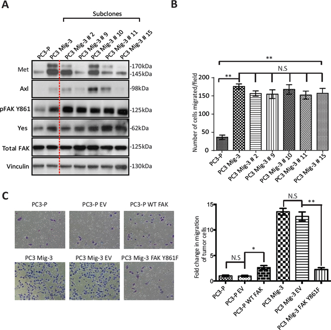 Figure. 3: Increased phosphorylation of FAK Y861 is associated with increased migration of PC3 Mig-3 cells. (A) Expression of signaling proteins in single cell clones of PC3 Mig-3 cells. PC3 Mig-3 cells were subjected to single cell cloning; immunoblotting was performed for indicated proteins. Lane-1:PC3-P cells; lane-2:PC3 Mig-3 cells; lanes 3 to 7:subclones of PC3 Mig-3 cells. (B) Migration assays on subclones of PC3 Mig-3 cells. Bars represent means ± SD. Three independent assays were performed in triplicate. **p < 0.001 by Student's t-test from three independent assays performed in triplicate; N.S, no statistical difference. (C) Effect of overexpression of the non-phosphorylatable FAKY861F on migration of PC3 Mig-3 cells. Representative photomicrographs of migrated cells (left panel); quantification (right panel). Bars represent the means ± SD (right panel). *p < 0.01, **p < 0.001 by Student's t-test of three independent assays performed in triplicate.