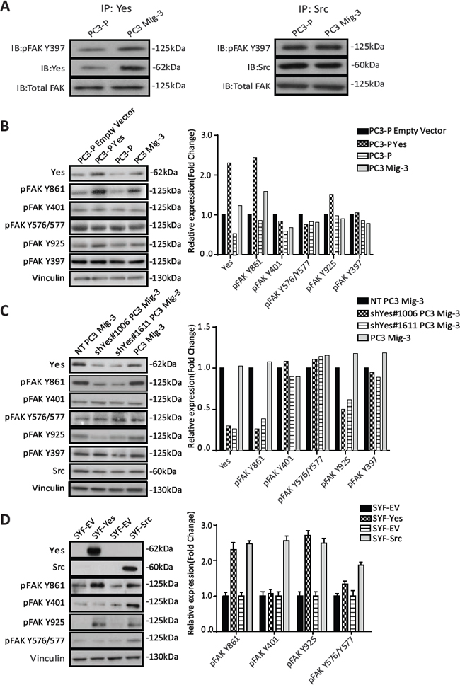 Yes association with FAK is increased in PC3 Mig-3 cells