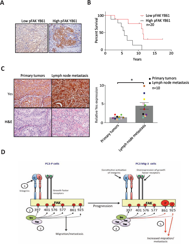 Figure. 8: Expression of pFAK Y861 and Yes in PCa patients. (A) Expression of pFAK Y861 in lymph node metastasis from patient tumors by immunohistochemistry. (B) Kaplan-Meier survival plot. Average survival time of cases with high pFAK Y861 expression: 6.1 ± 1 years with low pFAK Y861: 11.7 ± 1.7 years; p = 0.008 by log rank test. (C) Expression of Yes in paired primary tumors and lymph node metastases from prostate cancer patients by immunohistochemistry. Representative photomicrographs in primary tumor (upper right panel) and corresponding lymph node metastasis (upper left panel). Corresponding H&E are shown in lower panels. Bars represent the average fold-change ± SEM in Yes expression in primary tumor compared to corresponding lymph node metastases, with matching colored data points indicating primary tumor and corresponding lymph node metastasis (right panel). *p < 0.05 by Student's t-test. (D) Model for restrictive phosphorylation of FAK Y861 and FAK Y925 by Yes in the PC3 Mig-3 cells. 1) Integrin clustering and/or growth factor receptor activation lead to phosphorylation of FAK Y397. 2) pFAK Y397 recruits SFKs via their SH2 domain. 3) SFKs phosphorylate FAK at specific tyrosines, recruiting signaling proteins important to FAK's scaffolding function. 4) PCa progression leads to increased transcription and expression of Yes, leading to preferential binding of Yes to pFAK Y397. 5) Yes binding to pFAK Y397 leads to preferential phosphorylation of FAK Y861 and to a lesser extent, FAK Y925 increasing migration, invasion and metastatic potential of PCa cells.