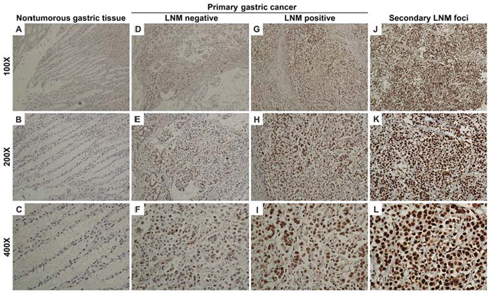 Figure 1: CREB1 expression in nontumorous gastric mucosa, primary gastric cancer tissues and secondary lymph node metastatic foci by immunohistochemistry. (A–C) Negative CREB1 expression in nontumorous gastric mucosa (only nuclear staining was considered in this study). (D–F) Weak intensity with low positivity rate in primary gastric cancer tissues without lymph node metastasis. (G–I) Weak to strong intensity with moderate positivity rate in primary gastric cancer tissues with lymph node metastasis. (J–L) Strong intensity with high positivity rate in secondary lymph node metastatic foci.