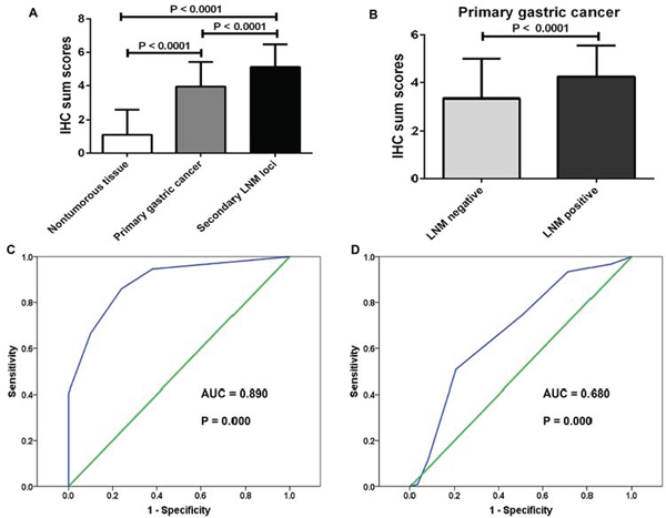 Figure 2: Upregualtion of CREB1 in more aggressive gastric tissues and ROC curves to assess the diagnostic value of CREB1 expression in gastric cancer. (A) IHC sum scores (0–7) were used to compare CREB1 expression in different gastric tissues. CREB1 was significantly elevated in primary gastric cancer tissues compared to nontumorous gastric mucosa (t-test, P < 0.0001). Further upregualtion of CREB1 was observed in secondary lymph node metastatic foci (t-test, P < 0.0001). (B) CREB1 was dramatically overexpressed in primary gastric cancer tissues with lymph node metastasis than those without lymph node metastasis (t-test, P < 0.0001). (C) The ROC curves reflected strong separation between gastric cancer tissues and nontumourous tissues, with an area under curve (AUC) of 0.890 (P = 0.000). (D) To test the ability of CREB1 as a diagnostic marker for lymph node metastasis, ROC curves were established. Clear separation was observed between the patients with and without lymph node metastasis, with an AUC of 0.680 (P = 0.000).