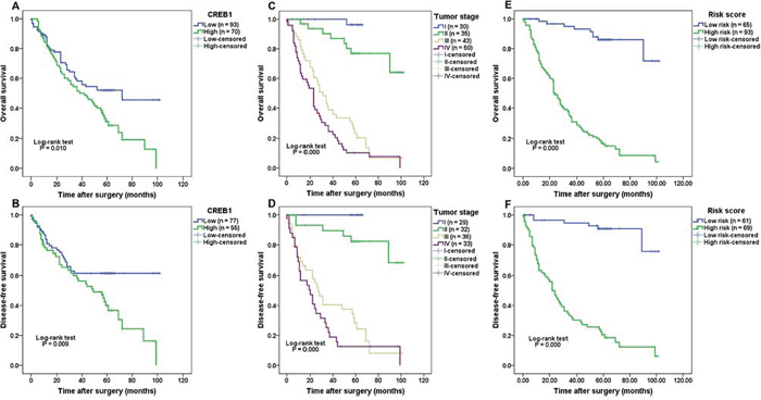 It is generally accepted that TNM tumor stage is the most important prognostic determinant [26] for cancer patients. However, it still has several limitations in clinical practice [27, 28]. For example, some subgroups of the TNM classification did not have significantly different survival rates [27, 29]. Thus the prognostic model, which has been used in previous studies [17], was constructed in an attempt to test whether CREB1 expression could improve the predictive power of the conventional TNM tumor stage. As expected, the prognostic model is a more powerful predictor than CREB1 expression or tumor stage alone. We observed clearer separation between high-risk and low-risk subgroups of the prognostic model in the survival curve. And, compared with CREB1 and tumor stage, risk score showed higher HR (hazard ratio) in stratifying patients with different prognosis.