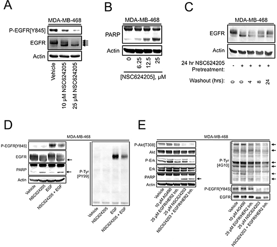 Figure 2: EGFR/HER2/HER3-targeted Compounds Induce Cell Death and Suppress Response to EGF. (A) MDA-MB-468 cells treated as indicated for 24 hours were analyzed by immunoblot for levels of EGFR and EGFR phosphorylation. (B) MDA-MB-468 cells treated as indicated for 24 hours were analyzed by immunoblot for PARP cleavage. (C) MDA-MB-468 cells were either left untreated, or treated with 20 μM NSC624205 for 24 hours. NSC624205-treated cells were then washed and incubated for the indicated periods in the absence of drug. EGFR electrophoretic mobility was analyzed by immunoblot. (D) MDA-MB-468 cells were pretreated with 25 μM NSC624205 or vehicle for 15 hours and then either left untreated or stimulated for 15 minutes with 20 ng/ml EGF, after which cell extracts were analyzed by immunoblot. (E) MDA-MB-468 cells were treated as indicated for 24 hours and analyzed by immunoblot.