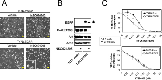 T47D cells are not killed by NSC624205, therefore we examined whether this is because these cells do not overexpress EGFR. Interestingly, T47D cells with enforced EGFR expression underwent cell death in response to NSC624205, but vector control cells did not (Figure 3A). As observed above, NSC624205-mediated cell death correlated with an EGFR electrophoretic mobility shift, and decreased Akt phosphorylation (Figure 3B). Cell proliferation assays showed that similarly, EGFR overexpressing T47D cells were more sensitive to NSC624203 than the control cells (Figure 3C). However, no difference between the two cell lines was observed when proliferation was suppressed using PI3-kinase inhibitor LY294002.