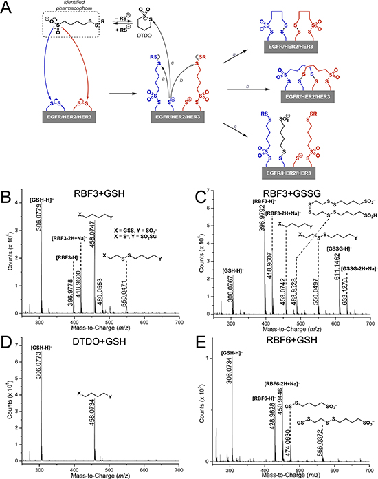 Figure 5: Evidence that EGFR/HER2/HER3-targeted Compounds Can Function as Disulfide Bond Disrupting Agents (DDAs). (A) Proposed model for how DDAs disrupt disulfide bonds by inserting into them and potentially changing their connectivity (a and b). Should cyclization of the pharmacophore occur to form DTDO, reaction with free thiols or thiolates (c) may lead to incorporation of the pharmacophore into the protein. (B, C) Mass spectra of reactions carried out between 10 mM RBF3 and 10 mM reduced (B) or oxidized (C) glutathione for 24 hours at 37°C, pH 7.0. (D, E) Mass spectra of reactions carried out between 10 mM DTDO (D) or 10 mM RBF6 (E) and 10 mM reduced glutathione for 24 hours at 37°C, pH 7.0. Reactions between DTDO or RBF6 and oxidized glutathione did not lead to products and the related mass spectra are not shown (see SI).