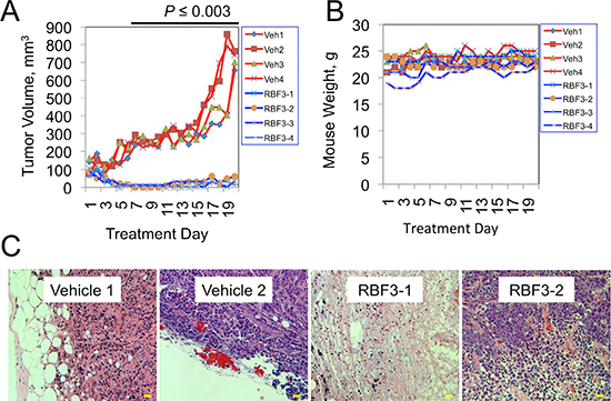 All experimental protocols were approved by the Institutional Animal Care and Use Committee of the University of Florida. Tumors were initiated by the injection of 2 × 106 BT474 cells into the mammary fat pads of female NSG mice (005557, The Jackson Laboratory, Bar Harbor, ME) in sterile saline. Mice with palpable tumors were randomly assigned to vehicle (water) or 40 mg/kg RBF3 treatment groups for tumor growth studies. Treatments were administered Monday through Friday by intraperitoneal injection. Tumor volumes were estimated using the formula: Volume = (L*L*W)/2, where tumor length, L > tumor width, W. Tumors and other tissues were fixed with 4% paraformaldehyde in phosphate-buffered saline. Tissues were paraffin embedded and sections were cut and stained with hematoxylin and eosin (H&E) by the University of Florida Molecular Pathology Core (http://molecular.pathology.ufl.edu/).
