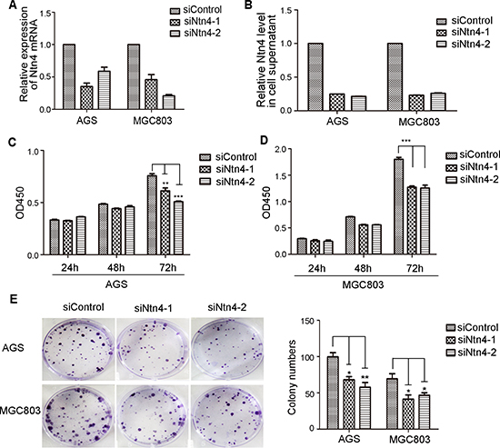 To address the efficacy of Ntn4 on GC cells, we knocked down Ntn4 in AGS and MGC803 cells using two siRNA oligoes targeting two well-identified regions of Ntn4 sequences (named siNtn4-1, siNtn4-2). As shown in Fig. 1, each GC cell line transfected with Ntn4 siRNA showed efficient silencing of Ntn4 expression, as determined by real-time RT-PCR and ELISA (Fig. 1A–1B). We observed the effect of Ntn4 knockdown on the proliferation of the GC cells. With CCK8 assay, we found that siNtn4 significantly decreased the viability of cells compared with scrambled siRNA (siControl) (Fig. 1C–1D). We also examined the effect of siNtn4 by clonogenic assay and found that Ntn4 knockdown notably suppressed clonogenic survival by inhibiting colony formation as shown in Fig. 1E. Taken together, our results demonstrated that siNtn4 inhibited cell proliferation of the GC cells.