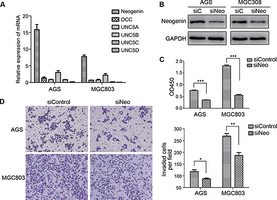 Figure 4: Down regulation of neogenin inhibited cell growth and invasion. A. The expression of Ntn4 receptors, neogenin (Neo), DCC and UNC5A-D were detected by Q-PCR. B. Neo expression was detected in the cells by western blot at 48 hours after transfected with siNeo or siControl. C. Neo silencing suppressed cell proliferation. Cells were transfected with siNeo or siControl for 48 hours and subjected to CCK8 assay. D. Neo knockdown restrained cell invasion. Cells were transfected with siNeo or siControl for 48 hours and subjected to the invasion assay; Magnification, × 100. Mean ± SEM, n ≥ 3. *p < 0.05, **p < 0.01, ***p < 0.001.