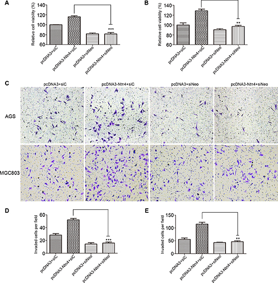 Figure 5: Neo knockdown reversed the promoted effects of Ntn4 on cell proliferation and invasion. A–B. Ntn4 overexpression promoted cell growth in a Neo dependent manner. The cell proliferation was performed in AGS (A) and MGC803 (B) cells co-transfected with pcDNA3+siC, pcDNA3+siNeo, pcDNA3-Ntn4+siC or pcDNA3-Ntn4+siNeo for 48 hours with CCK8 assay. C–E. Ntn4 overexpression couldn’t increase cell invasion in the absence of Neo. Cells were co-transfected with pcDNA3+siC, pcDNA3+siNeo, pcDNA3-Ntn4+siC or pcDNA3-Ntn4+siNeo for 48 hours and subjected to the invasion assay (C); Magnification, × 100. The invaded AGS (D) or MGC803 (E) cells on the bottom surface were counted and analyzed. Mean ± SEM, n ≥ 3. **p < 0.01, ***p < 0.001.