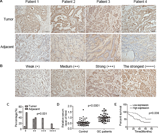 Figure 7: Ntn4 was overexpressed in GCs and negatively correlated with patient survival. A. IHC staining of human GC tissues using Ntn4-specific antibody, as described in Methods; Magnification, × 200. B–C. Classification of samples according to the intensity of staining of Ntn4 expression (n = 82, p = 0.001). D. ELISA analysis to determine serum level of Ntn4 in GC patients and normal controls (n = 52, p < 0.001). E. Kaplan-Meier curves for GC patients’ overall survival in the patients with high Ntn4 expression and low Ntn4 expression (n = 48, p = 0.038).