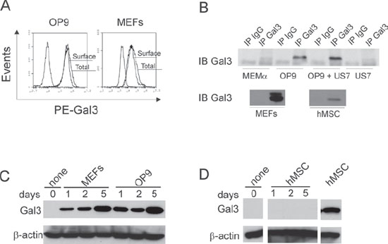 Figure 1: Protective stromal cells are the source of Galectin-3 present on ALL cells. A. Flow cytometric analysis of surface and total Galectin-3 in OP9 and MEF stromal cells. Total Galectin-3 was measured in permeabilized cells. Non-marked plot, isotype control. B. Concentrated medium above cells examined by immunoprecipitation for the presence of Galectin-3. MEMα, MEMα + 20% FBS = complete medium without cells; hMSC, primary human mesenchymal stem cells. IPs on panels group analysis done together in single experiments, using equal cell numbers and culture times to condition medium. One of three independent experiments with similar results. C, D. Western blot analysis for Galectin-3 in human ALL BLQ1 cells plated on d0 on the cell types indicated above the lanes.
