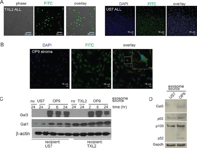 To further investigate exosome-mediated Galectin-3 transport, we cultured human ALL cells without OP9 cells for 24 hours to remove stroma-produced Galectin-3 associated with the ALL cells. Western blotting confirmed loss of Galectin-3 but the cells retained endogenous Galectin-1 (Figure 3C, lanes labeled ‘no’ -24). We then exposed the cells to ALL or OP9 exosomes in the absence of serum. As shown in Figure 3C, in ALL cells treated with OP9 exosomes, Galectin-3 levels increased within 2 hours. Interestingly, Galectin-1 levels also increased in US7 cells. Higher levels of p100, p52 and p65 NFκB were also measured in US7 cells exposed for 24 hours to OP9 exosomes, compared the same cells exposed to US7 exosomes (Figure 3D). Thus, our experiments present evidence for a two-way communication exchange of materials between ALL cells and their stromal support cells via exosomes.