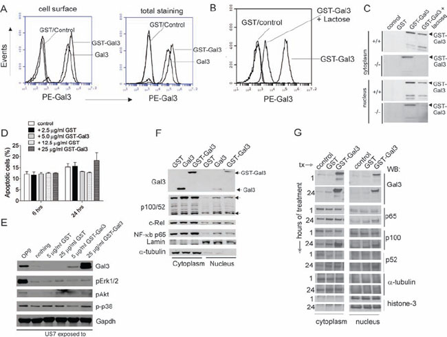 Figure 4: Exogenous Galectin-3 is internalized by human ALL cells. A. Human TXL2 cells cultured without stroma for 24 hours were incubated for an additional 24 hours (control), with 12.5 μg/ml GST (GST), 12.5 μg/ml Galectin-3 or 25 μg/ml GST-Gal3. Flow cytometric analysis for cell surface or total (in permeabilized cells) Galectin-3 with anti-Galectin-3 antibodies as indicated. B. TXL2 cells cultured without OP9 cells for 24 hours, then treated with 12.5 μg/ml GST or 25 μg/ml GST-Galectin-3 plus 50 mM lactose for an additional 24 hours. Galectin-3 cell surface levels in TXL2 cells determined by flow cytometry. C. Western blot analysis of lysates from wt and lgals3 −/− pre-B ALL cells exposed for 24 hours to nothing (control); 12.5 μg/ml GST, 25 μg/ml GST-Gal3 or 25 μg/ml GST-Gal3 + 50 mM lactose. The two smaller proteolytic products were also present in this input GST-Galectin-3 (26 kDa GST + 27.5 kDa Galectin-3) recombinant protein. D. Effect of exogenous Galectin-3 on apoptosis of US7 cells indicated as percentage Annexin V+, PI+ cells at the indicated time points determined by FACS. One of two experiments with similar results. E. Western blot analysis for signal transduction pathway activation in US7 cells cultured without OP9 for 24 hours, then treated for 24 hours as indicated above the panel. F. Nuclear and cytoplasmic lysates of TXL2 cells treated with GST, Galectin-3 or GST-Galectin-3 for 24 hours in the absence of OP9 cells analyzed by Western blot. G. Nuclear and cytoplasmic fractions of TXL2 cells kept without stroma for 24 hours, then stimulated with the proteins indicated above the lanes for 1 hour or 24 hours. Control, cells re-plated on OP9. Lamin, histone-3 and α-tubulin, loading controls for nuclear and cytoplasmic fractions, respectively.