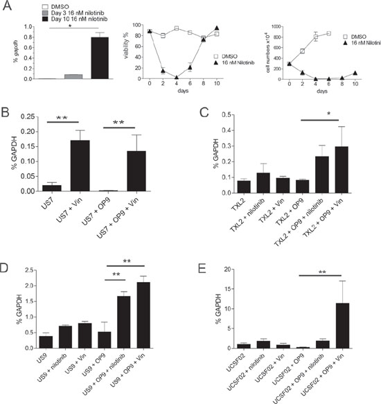 To measure mRNA levels during drug exposure, US7, UCSFO2, US9 or TXL2 cells were held in MEM-α medium with 20% FBS, 1% L-glutamine and 1% penicillin/streptomycin for 24 hours without OP9 stroma, then treated or not with 5 nM vincristine or 1 μM nilotinib for an additional 24 hours. Parallel samples were kept on OP9 for 24 hours, and then treated for 24 hours, or not, with vincristine or nilotinib. To measure the effect of exogenous Galectin-3 stimulation, human ALL cells harvested from the medium of co-cultures with OP9 were kept for 24 hours in medium without OP9 stroma. Cells were then exposed to medium, or molar equivalent GST, GST-Galectin-3 or Galectin-3 for an additional 24 hours or plated on OP9 as positive control. Viability of US7 and TXL2 cells kept without OP9 for 24 hours was >90%.