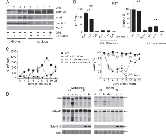 Figure 8: Inhibition of canonical NFκB signaling. A. Cytoplasmic or nuclear lysates (10 μg/lane) from TXL2 cells cultured for 24 hours without OP9 stroma to remove preexisting Galectin-3, then treated for 24 hours with 10 μM BMS345543 (lanes 1 and 2) or DMSO (lanes 3 and 4) in the absence (lanes 1 and 3) or presence (lanes 2 and 4) of OP9 stromal support as also indicated below the panel. TXL2 ALL cells were harvested from the medium. B. US7 cells treated with the indicated concentrations of BMS345541 alone or combined with 5 nM vincristine. Cell numbers (left panel) and viability (right panel) were determined after 72 hours using Trypan blue exclusion. Results shown are representative of two independent experiments with both US7 and TXL2 with very similar results (**p < 0.001). C. long-term treatment of US7 cells in the presence of irradiated stromal cells with 2.5 nM vincristine, 2 μM BMS345541, or both as indicated. Fresh drug was added with every medium change. D. Western blot analysis of samples from (C) taken at days 3 and 22 as indicated. v, vincristine; bv, BMS345541 + vincristine; b, BMS345541; c, control DMSO. Not enough cells remained on d22 for Western blot analysis of the bv treated culture.