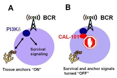 The phosphoinositide 3-kinase (PI3K) signaling pathway is involved in a wide variety of normal cellular processes including cell death and survival, migration, protein synthesis, and metabolism. PI3Ks are also commonly activated in human cancers [1], either by activating mutations of PI3K signaling modules, or by pathway activation after triggering of surface receptors. PIK3CA, the gene encoding the PI3K catalytic subunit (p110α), PTEN inactivation, or mutations in the p85 regulatory subunit are examples of activating PI3K mutations found in solid tumors. In contrast, leukemia and lymphoma cells do not harbor activating PI3K mutations [2], but nonetheless PI3Ks are constitutively activated, presumably due to activating signals from the microenvironment. In this context, PI3K signaling is now targeted in first clinical trials in patients with B cell malignancies, including Chronic Lymphocytic Leukemia (CLL), which represent one of the first molecularly targeted therapies for B cell malignancies.