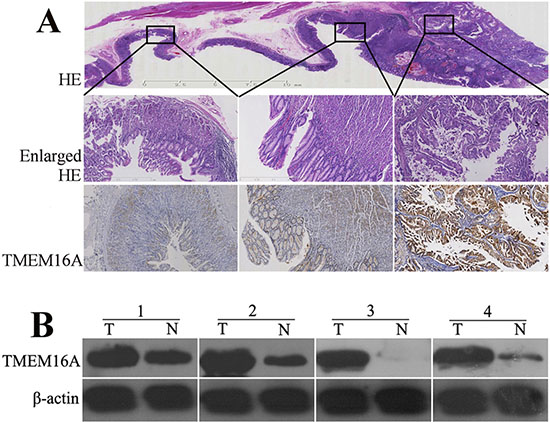 Figure 1: The expression of TMEM16A protein in gastric cancer, adjacent and normal tissues. A. A representative hematoxylin and eosin (HE) stained mounted section containing gastric cancer, adjacent and normal gastric mucosa (the upper row, original magnification, ×4) with enlarged view(the middle row, original magnification, ×40). The lower row displayed that TMEM16A was strongly expressed in gastric cancer(the right panel), whereas was moderately or weakly expressed in adjacent(the middle panel) and normal tissues(the left panel) (original magnification, ×40). B. Western blot analysis of TMEM16A protein expression in four pairs of matched gastric tumor (T) and adjacent non-tumor mucosa (N). Equal loading of protein was determined by β-actin.