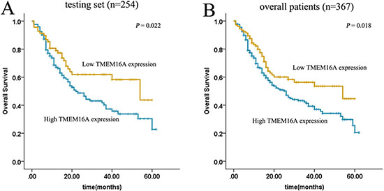 To generate a reasonable cutoff score of TMEM16A protein for further survival analysis, we firstly subjected the IHC scores of TMEM16A protein to operating characteristic (ROC) curve analysis with respect to their overall survival in the training set. We found that the IHC score cutoff point of TMEM16A was 8.5. We thus selected a TMEM16A expression score of 8 (> 8 VS. ≤ 8) as the cutoff point to distinguish the patients as high or low expression for survival analysis in the testing set.