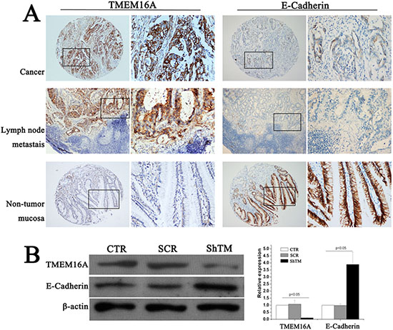 In this study, we aimed to examine the role and potential mechanisms of TMEM16A in GC by a retrospective analysis of 367 GC patients and 5 mounted section GC tissues, and by carrying out in vitro experiments to clarify the impact of TMEM16A on GC proliferation, invasion and potential mechanism. We found that TMEM16A was markedly upregulated and amplified in GC tissues, and its overexpression significantly correlated with the clinicopathological characteristics and shorter survival of patients with GC, also its expression was inverse relation with E-cadherin in 367 GC specimens, corresponding lymph node metastases and adjacent no-tumor tissues. Downregulation of TMEM16A abrogated the ability of migration and invasion and promoted E-cadherin expression. We further demonstrated that knockdown TMEM16A inhibited secretion of TGF-β to upregulate E-cadherin expression. Our findings suggest that TMEM16A plays a role in invasion and metastasis in GC, and might be a novel prognostic biomarker and potential therapeutic target in the treatment of patients with GC.
