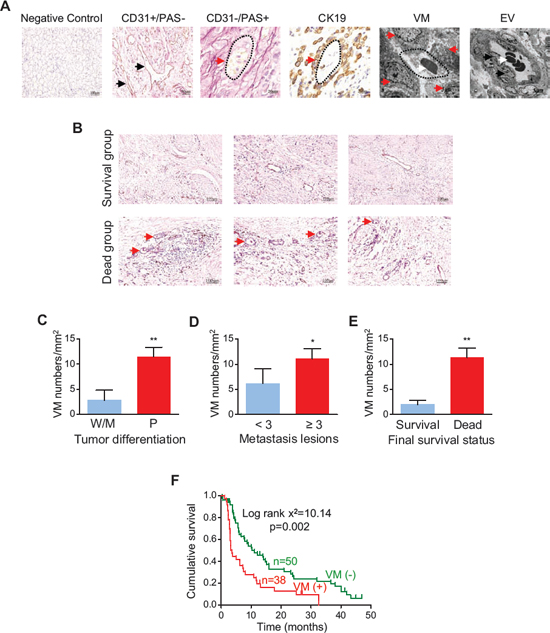 Figure 1: VM in human gastric cancer (GC) tissues and its relation with the clinical outcome. (A) Representative pictures of vessels formed in GC tissues by endothelium-dependent angiogenesis and structures formed by vasculogenic mimicry (VM), which were confirmed by CD31/PAS staining and transmission electron microscopy (TEM). Negative control is indicated in panel 1. CD31-positive structures (brown color, indicated by black arrows in panel 2) are vessels with an endothelial lining, while PAS-positive networks are VM channels lined by tumor cells (pink color, indicated by red arrow in panel 3). CK19-positive staining shows VM is surrounded by tumor cells (brown color, indicated by red arrows in panel 4). Panels 5 and 6 show VM structure (red arrows) and endothelial cells of a blood vessel (black arrows) by TEM, respectively; several blood cells (white arrows) are surrounded by a complete vessel wall. Original magnification: × 200 (panel 1); × 400 (panel 2); × 1000 (panels 3 and 4); × 8000 (panel 5); × 5000 (panel 6). (B) Representative photomicrographs showing VM density in survivors and non-survivors. (C–E) VM density in GC patients stratified by tumor differentiation [W, well differentiated; M, moderately differentiated; P, poorly differentiated (C)], metastasis (D), and survival (E). *p < 0.05; **p < 0.01 versus the corresponding control group, n = 14 and n = 74 for the W/M group and P group, respectively; n = 18 and n = 70 for < 3 and ≥ 3 metastasis lesions, respectively; n = 12 and n = 76 for survivors and non-survivors, respectively. (F) Kaplan-Meier plot showing the influence of VM density on the survival of patients with stage IV GC.