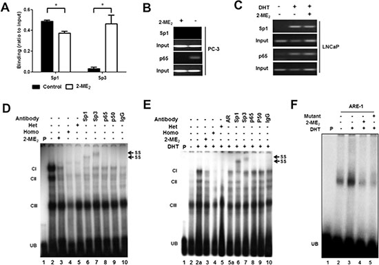 Figure 2: Sp1, Sp3 and NFκB bind to the endogenous c-FLIP promoter. (A) DU145 cells were untreated or treated with 2-ME2 (5 μM) for 24 h, and chromatin immunoprecipitation quantitative real-time PCR (ChIP-qPCR) was performed using anti-Sp1 or anti-Sp3 antibody. The amplification value from immunoprecipitated DNA was normalized to 10% input. Error bars indicate ± S.E.M. (n = 3). *p < 0.05. (B) PC-3 cells were untreated or treated with 2-ME2 (5 μM) for 24 h. (C) LNCaP cells were untreated or treated with 2-ME2 (3 μM) for 6 h in the presence or absence of DHT (1 nM). Gel-based ChIP-PCR was performed using anti-Sp1 or anti-p65 antibody. (D) Binding of AR, Sp1, Sp3 and p65 to the c-FLIP promoter sequence elements containing Sp1, NFκB, or AR binding sites to nuclear extracts prepared from PC-3 cells using electrophoretic mobility shift assay (EMSA). PC-3 cells untreated or treated with 2-ME2 (3 μM) for 24 h. Radiolabeled c-FLIP probe was preincubated with 100-fold molar excess of unlabeled c-FLIP sequence (homologous) or Sp1 oligonucleotide with mutation (heterologous) for 5 min prior to incubation with nuclear extracts. Nuclear extracts pre-incubated with indicated antibodies for 30 minutes on ice were used in super-shift experiments. (E) Nuclear extracts prepared from LNCaP cells untreated or pretreated with 2-ME2 (3 μM) for 6 h prior to stimulation with DHT (1 nM) for 1 h were used in EMSA. EMSA was carried out essentially as described above. (F) Binding of nuclear extracts from untreated or 5α-DHT stimulated LNCaP cells to c-FLIP ARE-1 (+57/+71) as radiolabeled probe was shown. (CI-III: DNA-protein complexes, UB: unbound free probe, SS: super-shifted bands).