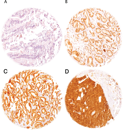 Freshly cut TMA sections were immunostained on one day and in one experiment. For HOXB13 immunohistochemistry, slides were deparaffinized and exposed to heat-induced antigen retrieval for 5 minutes in an autoclave at 121°C in pH 7.8 Tris-EDTA-Citrate buffer. Primary antibody specific for HOXB13 (mouse monoclonal antibody, Abcam, Cambridge, UK; cat# 53931; dilution 1:25) was applied at 37°C for 60 minutes. These conditions were selected in order to optimally distinguish between different expression levels of HOXB13. At a dilution of 1:25, there were both strongly nuclear positive but also entirely negative prostate cancers. HOXB13 staining was predominantly nuclear and typically paralleled by cytoplasmic co-staining. For PSA immunohistochemistry, slides were deparaffinized. No antigen retrieval step was performed. Primary antibody specific for PSA (mouse monoclonal antibody, Novocastra; cat# NCL-L-PSA-28A4; dilution 1:50) was applied at 37°C for 60 minutes. PSA staining was localized to the cytoplasm. Bound HOXB13 and PSA antibodies were visualized using the EnVision Kit (Dako, Glostrup, Denmark) according to the manufacturer´s directions. Nuclear HOXB13 staining was evaluated according to the following scoring system: The staining intensity (0, 1+, 2+, and 3+) and the fraction of positive tumor cells were recorded for each tissue spot. A final score was built from these two parameters according to the following established criteria. Negative: absence of staining; weak: staining intensity of 1+ in ≤ 70% of tumor cells or staining intensity of 2+ in ≤ 30% of tumor cells; moderate: staining intensity of 1+ in > 70% of tumor cells or staining intensity of 2+ in > 30% but in ≤ 70% of tumor cells or staining intensity of 3+ in ≤ 30% of tumor cells; strong: staining intensity of 2+ in > 70% of tumor cells or staining intensity of 3+ in > 30% of tumor cells. Cytoplasmic PSA staining intensity was estimated in a four-step scale including negative (no detectable staining), weak, moderate, and strong staining.