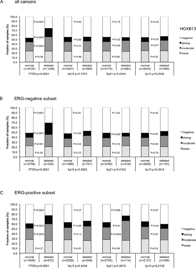 Earlier studies had provided evidence for recurrent chromosomal deletions delineating further molecular subgroups amongst ERG positive and ERG negative prostate cancers. In particular, deletions of PTEN and 3p13 define subgroups in ERG positive and deletions of 5q21 and 6q15 define subgroups in ERG negative cancers [20, 21, 23]. To examine, whether HOXB13 expression might be particularly associated with one of these genomic deletions, HOXB13 data were compared to preexisting findings on PTEN (10q23), 3p13 (FOXP1), 6q15 (MAP3K7) and 5q21(CHD1) deletions. Elevated HOXB13 expression levels were strongly linked to deletions of PTEN in all cancers (Figure 3A) as well as in the subsets of ERG- negative (Figure 3B) and ERG- positive cancers (p < 0.0001 each, Figure 3C). However, HOXB13 was largely unrelated to all other deletions irrespective of whether all cancers or subgroups of ERG positive or ERG negative cancers were analyzed.