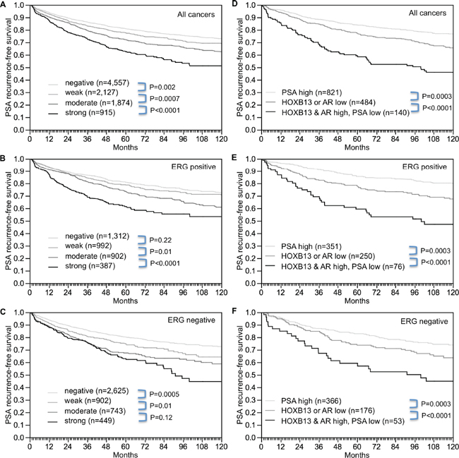Figure 5: Association between HOXB13 expression and biochemical recurrence. (A) all cancers, (B) ERG-IHC positive cancers, and (C) ERG-IHC negative cancers. Combined effect of HOXB13, AR and PSA in (D) all cancers, (E) ERG-IHC positive cancers, and (F) ERG-IHC negative cancers.