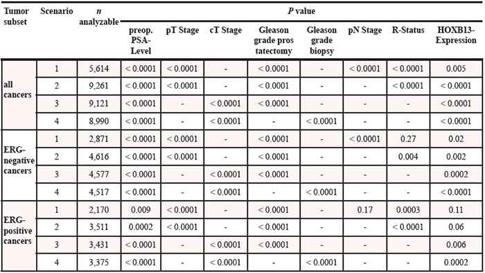 Table 3: Multivariate analysis including HOXB13 expression in all cancers, the ERG-negative and ERG-positive subset. Scenario 1 includes all postoperatively parameters. Scenario 2 excludes the lymph node (pN) stage. Scenario 3 replaces the pathological tumor (pT) stage with the clinical (cT) stage and omits the surgical margin (R) status. Scenario 4 includes all preoperative available parameters
