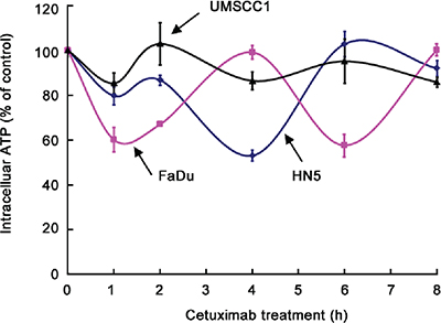 Figure 2: Oscillation in intracellular ATP levels after cetuximab treatment in different HNSCC cell lines. HN5, FaDu, and UMSCC1 cells were cultured in medium containing 0.5% FBS and low glucose (1 g/L) with 20 nM cetuximab in triplicate wells for 1, 2, 4, 6, and 8 h. The levels of intracellular ATP were determined using the ATP Bioluminescent Assay Kit (Sigma-Aldrich). The ATP levels at each time point were normalized to the ATP levels of the untreated cells at the corresponding time points.