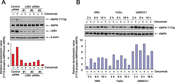 Figure 3: Transient activation of AMPK after cetuximab treatment in different HNSCC cell lines. (A) HN5 cells were transfected with a control siRNA or one of three different LKB1-targeting siRNAs (designated as #1, #2, and #3, respectively). Forty-eight hours after transfection, the cells were treated with 20 nM cetuximab or not for 1 h. Cell lysates were then prepared and subjected to Western blot analysis with the indicated primary antibodies. The densitometric value of T172-phosphorylated AMPK in each lane was normalized to the densitometric value of total AMPK in the corresponding lane and plotted in arbitrary units. (B) HN5, FaDu, and UMSCC1 cells were cultured in 0.5% FBS medium in the absence or presence of 10 nM or 20 nM cetuximab for 2, 6, and 16 h. Cell samples were subjected to Western blot analysis for levels of T172-phosphorylated AMPK and total AMPK, and the densitometric value of T172-phosphorylated AMPK in each sample was analyzed as described in (A).