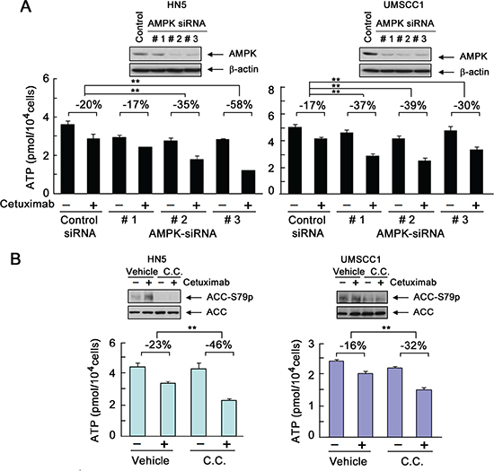 Figure 4: Transient activation of AMPK counteracts cetuximab-induced decline in intracellular ATP level. (A) HN5 and UMSCC1 cells were transfected with a control siRNA or one of three different AMPK-targeting siRNAs (designated as #1, #2, and #3, respectively). Forty-eight hours after transfection, the cells were treated with 20 nM cetuximab or not for 1 h. Intracellular levels of ATP in each sample were measured using the ATP Bioluminescent Assay Kit (Sigma-Aldrich). The negative percentages indicate the extent of inhibition of intracellular ATP level by cetuximab compared with the ATP level in the control group under each of the indicated conditions. **p < 0.01. Insets, Western blots showing knockdown of AMPK expression in cells transfected with AMPK-targeting siRNAs or control siRNA. (B) HN5 and UMSCC1 cells were cultured in 0.5% FBS medium in the presence of 10 μM dorsomorphin (C.C. for “compound C”) for 16 h and then treated with 20 nM cetuximab or not for 1 h. Cell samples were prepared for measurement of intracellular ATP level, and the data were expressed as described in (A). Insets, Western blots showing inhibition of S79 phosphorylation of ACC by dorsomorphin.