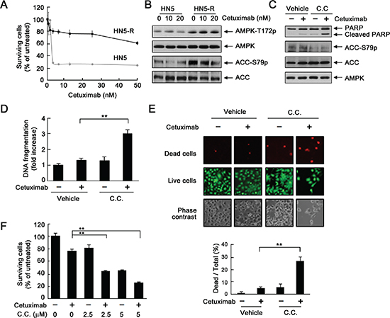 Figure 6: Inhibition of AMPK overcomes acquired resistance to cetuximab via induction of apoptosis. (A) HN5 cells and HN5-R cells were cultured in 0.5% FBS medium containing the indicated concentrations of cetuximab for 5 days and then subjected to MTT assay. (B) HN5 and HN5-R cells were cultured in 0.5% FBS medium in the absence or presence of 10 or 20 nM cetuximab for 24 h. Cell lysates were then prepared and subjected to Western blot analysis with the indicated primary antibodies. (C) HN5-R cells were cultured in 0.5% FBS medium in the presence of 20 nM cetuximab, 10 μM dorsomorphin (C.C. for “compound C”), or both for 24 h. Cell lysates were then prepared and subjected to Western blot analysis with the indicated primary antibodies. (D) HN5-R cells were treated as described in (C). Cell lysates were subjected to a quantitative apoptosis ELISA (Roche Diagnostics). (E) HN5-R cells were treated as described in (C). The cells were subjected to a LIVE/DEAD assay (Life Technologies) and observed under a fluorescent microscope. The ratio of dead cells to total cells in each group was calculated as described in Materials and Methods. **p < 0.01. (F) HN5-R cells were treated with 20 nM cetuximab alone or in combination with 2.5 or 5 μM dorsomorphin for 72 h. Cell viability was determined by MTT assay. The OD values of the treated cells were normalized to the OD value of the untreated cells, which was set as 100%. Data shown are means and SDs (n = 3). **p < 0.01.