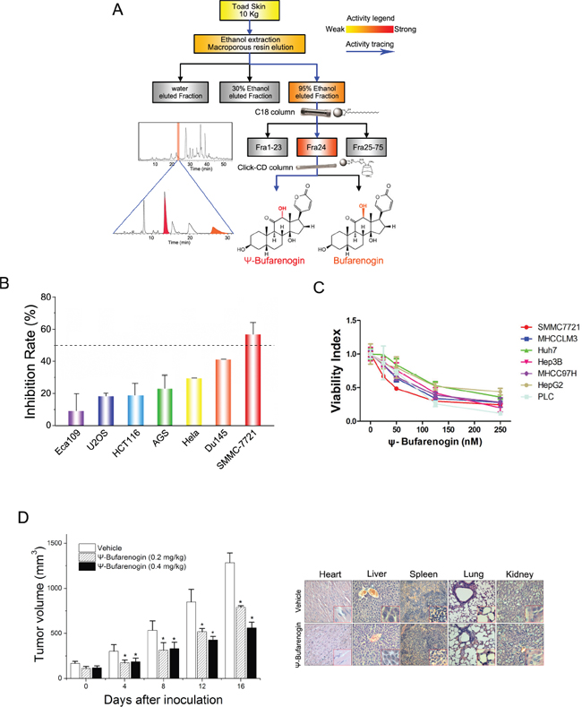 Figure 1: The therapeutic effect of ψ-Bufarenogin on liver cancer. (A) A flow diagram of ψ-Bufarenogin isolation from toad skin using reversed-phase liquid chromatography coupled with hydrophilic interaction chromatography as previously described. (B) Seven cancer cell lines were exposed to 50 nM ψ-Bufarenogin for 48 hours. The cell viability was measured by CCK-8 assay and the inhibition rate was calculated. Data are represented as mean ± SEM. *p < 0.05. (C) Seven HCC cell lines were treated with ψ-Bufarenogin for 48 hours followed by a cell viability assay. Data are represented as mean ± SEM. *p < 0.05. (D) SMMC-7721 cells-derived xenografts were implanted s.c. in the flanks of nude mice followed by i.v. administration of ψ-Bufarenogin. Tumor volume was monitored as described above (left). H&E staining of mice organs was performed after ψ-Bufarenogin therapy (right).