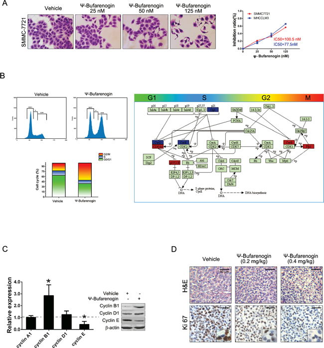 Figure 2: ψ-Bufarenogin suppresses hepatoma cells proliferation. (A) SMMC-7721 and MHCC-LM3 cells were exposed to ψ-Bufarenogin at indicated dosages for 48 hours. CCK-8 assay was performed to calculate the inhibition rate and IC50. The cells were then stained with crystal violet and representative pictures were shown. (B) The cell cycle distribution of ψ-Bufarenogin-treated hepatoma cells was analyzed by flow cytometry (left). The differential expression of cell cycle-related genes in ψ-Bufarenogin-treated SMMC-7721 cells relative to control cells were achieved by Illumina microarray. Box in Red indicates upregulation and box in blue indicates downregulation (right). (C) The fold change of cyclin expression in ψ-Bufarenogin-treated SMMC-7721 cells relative to control cells was analyzed by real-time PCR. Western blot was conducted as described in Method. (D) The H&E staining and immunohistochemistry of Ki-67 antigen from xenografted hepatoma in mice treated with ψ-Bufarenogin (i.v.) as described above.