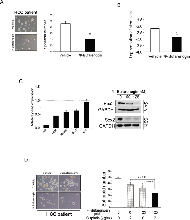 Figure 4: ψ-Bufarenogin inhibits the expansion of hepatic T-ICs. (A) Spheroid formation assay of ψ-Bufarenogin (50 nM)-treated primary hepatoma cells isolated from patients. Data are represented as mean ± SEM. *p < 0.05. (B) Limiting dilution assay of SMMC-7721 cells exposed to ψ-Bufarenogin (50 nM), and the estimated proportion of cancer stem cells was shown as its natural logarithm. Data are represented as mean ± SEM. *p < 0.05. (C) Relative expression levels of Sox2, Oct4, Nanog, Bmi1 and Klf4 in SMMC-7721 cells treated with ψ-Bufarenogin in comparison with control cells. Data are represented as mean ± SEM. *p < 0.05. Western blot assay of Sox2 expression in SMMC-7721 cells exposed to ψ-Bufarenogin. (D) Spheroid formation assay of patient primary hepatoma cells treated with ψ-Bufarenogin and/or cisplatin. Data are represented as mean ± SEM. *p < 0.05.