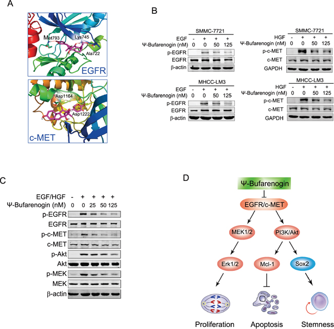 Figure 6: Dual inhibition of EGFR and c-MET by ψ-Bufarenogin in HCC. (A) Binding model of ψ-Bufarenogin in the dimerization pocket of EGFR or c-MET. The position of hydrogen bonds between ψ-Bufarenogin (purple) and EGFR or c-MET was indicated. (B) The effect of ψ-Bufarenogin on the phosphorylation EGFR and c-MET in hepatoma cells was determined by western blot assay. (C) Western blot assay of EGFR and c-MET in addition to their downstream signaling molecules in EGF/HGF-stimulated SMMC-7721 cells pretreated with ψ-Bufarenogin. (D) A schematic representation of the mechanism underlying the inhibitory role of ψ-Bufarenogin against HCC progression.