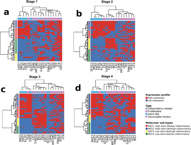 Consensus unsupervised analysis of the immunohistochemistry scoring revealed proteins with co-expression patterns that grouped into two distinct clusters and one heterogeneous cluster (Figure 1b). Expression cluster 1 contained predominately markers associated with stem-like characteristics; CD44, LGR5, SOX2 and OCT4, while cluster 2 contained inflammatory and immune associated markers; CD8, CD3, COX2 and FOXP3. Cluster 3 was a more heterogeneous group containing markers associated with a wider range of characteristics. Given the clear biology emerging at this stage, we focused on the identified distinct clusters 1 and 2. Expression of either a high stem-like or inflammatory pattern was not mutually exclusive and resulted in the appearance of four clearly distinct patient clusters. Using these clusters, we categorized the patients into one of four molecular sub-types (MST1–4) based on their expression pattern of either the stem-like markers or the inflammatory markers. These subtypes were MST1; high stem-like/low inflammatory, MST2; high stem-like/high inflammatory, MST3; low stem-like/high inflammatory, MST4; low stem-like/low inflammatory (Figure 1).