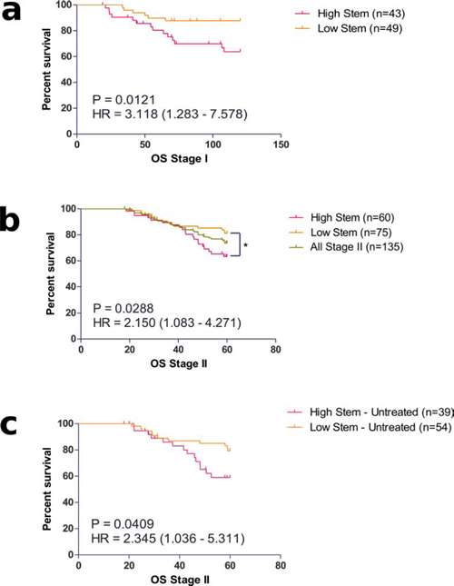 Within our stage II cohort, we have patients who were either treated with adjuvant chemotherapy (30%) or untreated (70%). Although the treatment was heterogeneous, it was predominantly fluorouracil based (5FU). Analysis of the patients who received no adjuvant treatment confirmed the true prognostic value of the stem-like classifier (Figure 2c), with an increased HR of 2.345 (CI 1.036 – 5.311; p = 0.0409) in the high-stem patients compared to the low-stem sub-group. More importantly, analysis of the stem-like classifier in the treated-only group failed to show any prognostic value to the classifier (Supplementary Figure S2), suggesting that treatment of patients in the poor prognostic high stem-like group might improve their overall survival.