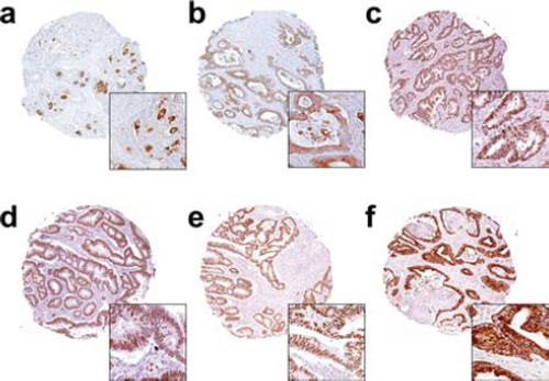 The details of construction of the tissue microarray has been previously described [26]. Briefly, representative areas of tumor were initially marked on hematoxylin and eosin stained slides by a pathologist. These areas were taken from the center of the colorectal tumor and were subsequently cored from the donor tissue block using a 0.6 mm diameter cylinder. The cylinder cores were then transplanted into a recipient paraffin block. These processes were carried out using an ATA-100 tissue arrayer (Chemicon International, Temecula, CA, USA). Three cores were taken from tissue blocks from each of the patients. A total of 10 tissue microarray blocks, arrayed in triplicates, were constructed for this study. Consecutive 5-μm sections were then placed on polylysine-coated slides for immunohistochemical analyses.