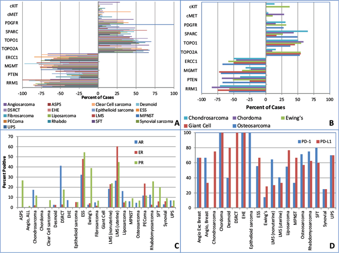 Figure 1: Protein biomarker expression by IHC. A. Soft tissue sarcomas B. Bone sarcomas C. Hormone receptors D. PD-1, PD-L1. ASPS = alveolar soft part sarcoma, DSRCT = desmoplastic small round cell tumor, EHE = epithelioid hemangioendothelioma ESS = endometrial stromal sarcoma, SFT = solitary fibrous tumor, LMS = leiomyosarcoma, UPS = undifferentiated pleomorphic sarcoma, MPNST = malignant peripheral nerve sheath tumor, PEComa = perivascular epithelioid cell tumor.