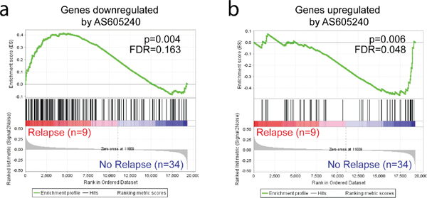 Figure 2: Genes responsive to PI3K inhibition show differential expression in T-ALL samples of patients who underwent relapse. Diagnostic T-ALL samples of patients who underwent relapse showed (a) higher expression of genes downregulated by AS605240 and, conversely, (b) lower expression of genes upregulated by AS605240 in primary cells in vitro.