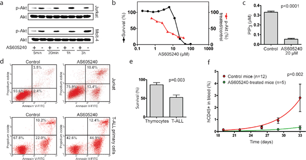 Figure 3: AS605240 inhibited p-Akt and PIP3 accumulation in T-ALL and showed anti-leukemic activity both in vitro and in vivo. (a) Western blotting analysis for Akt and p-Akt (Ser473) in Jurkat and Molt-4 cells treated with AS605240 IC50 values or vehicle. (b) Effect in cell survival and p-Akt accumulation of increasing concentrations of AS605240 in Jurkat cells. Survival was assessed by the MTT assay after 96 h of incubation. Quantification of p-Akt was performed with the AKT [pS473] ELISA Kit (Invitrogen) after 24 h of incubation. (c) AS605240 inhibits PIP3 accumulation, as assessed by PIP3 mass ELISA quantification in Jurkat cells incubated for 24 h with AS605240 or vehicle. P-value obtained with a paired T-test. (d) AS605240 induces apoptosis, as assessed by Annexin V/PI double staining and flow cytometry analysis in Jurkat and primary T-ALL cells treated with AS605240 or vehicle for 8 h and 6 h, respectively. Additional plots in Supplementary Figure 5. (e) Primary T-ALL cells (n = 7) are more sensitive to AS605240 than normal human thymocytes (n = 7). Cells were incubated with 10 μM of AS605240 for 48 h and survival was assessed by the MTT assay. P-value obtained with an unpaired T-test. (f) AS605240 prevents leukemic progression in NOD/SCID mice engrafted with primary T-ALL cells. Eleven days after the injection of 107 T-ALL cells, mice started to be treated with 20 mg/Kg of AS605240, intraperitoneally twice a day, 5 days a week. Peripheral blood proportion of human CD45+ cells was measured by flow cytometry analysis after red blood cells lysis. Exponential growth curves were compared with the F test of the best-fit K values. Error bars indicate the standard error of the mean (SEM).